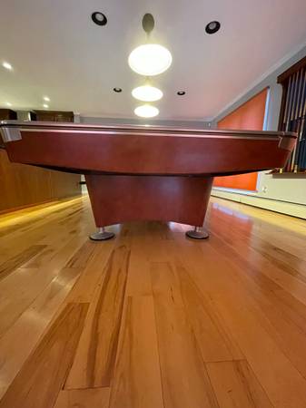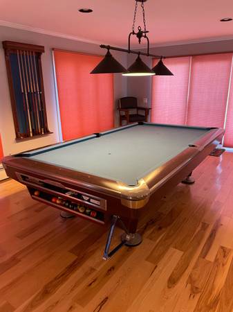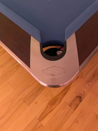 Gorgeous Brunswick Tournament Pool Table. Great style, no scratches or fading of the woodwork. The blue felt is by Simonis 860, it’s in good condition. The surface measures 100 x 50 inches. Height to the top of the bumper is 32” table height is 30 1/2” length is 9’6” and width is 64”.