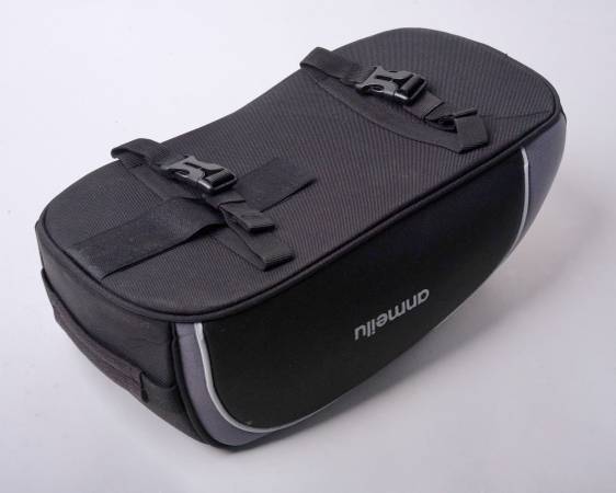 This pack is designed for mounting on a bike's rear rack frame. It securely attaches with buckled straps. It is fully padded and includes an extra interior space divider and straps, and rain cover....