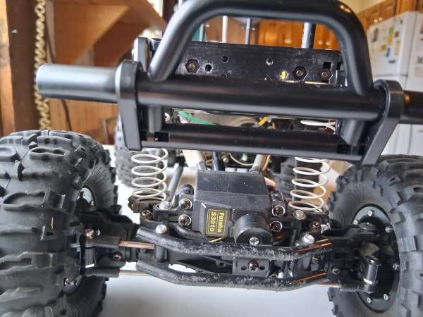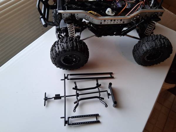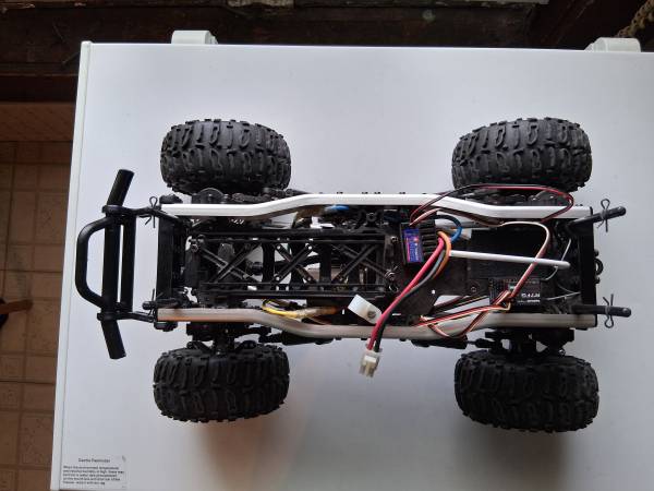 Tamiya CR-01 rock crawler chassis. 4wd/4ws. Will fit CR-01 Unimog, FJ Land Cruiser, and most likely any body that fits a CR-01 chassis. LOSI 2.2 Rock Claws mounted on generic metal beadlock rims. 2: Futaba 3020 Hi-torque steering servos. Both differentials are locked (they can be unlocked). Full ball bearings. New front bumper and parts tree with new front servo guard and body posts. Underside is scuffed up from plenty of use on my crawling courses/obstacles, but everything works as it should. NOTE: radio receiver and Tamiya ESC are NOT included, but I'm not gonna pull them until there's a sale. PS custom Unimog custom body is currently listed on eBay but I can offer a better deal thru CL. https://www.ebay.com/itm/257227727218 Call/text/email/cell: 37zero 1235. Vt area code. $300 or make offer