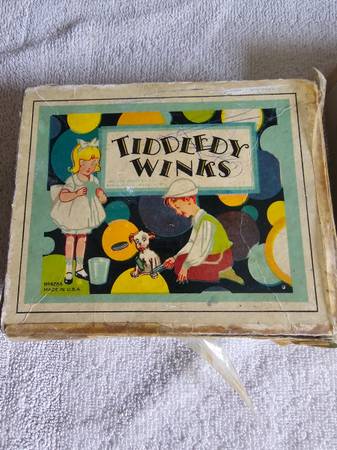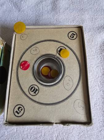 The vintage game is in the original box and contains a glass cup with 2 large chips, 6 smaller ones and playing instructions on the underside of the cover.