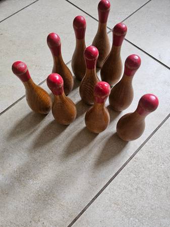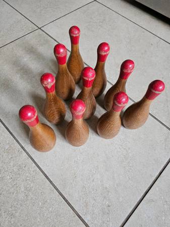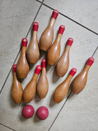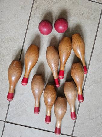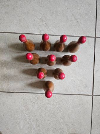 10 antique wooden pins with original paint and varnish plus two painted wooden balls. Perfect for a table top game.