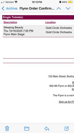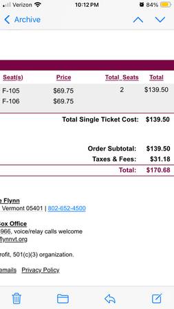 I have 2 tickets for the ballet row F center in Orchestra section at The Flynn on Thursday October 16th. Seats are seated together. Originally $170 with fees. Tickets were purchased at the Flynn. Tickets are E tickets I am the original purchaser and can’t attend.