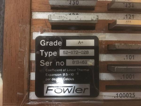 Excellent set of Fowler gage blocks. 2", 3" and 4" blocks were replaced with Mitutoyo. Grade is A+. Last calibration date was 3/28/2017. Some non-essential pieces are missing: .100025", .100075",...