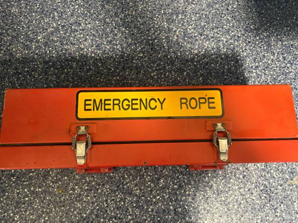 Metal emergency rope box. It’s not thin sheet metal. It’s heavy and very solid. The door opens on the bottom. I’m not sure what it came off of, but I was told a wild land firefighting truck
