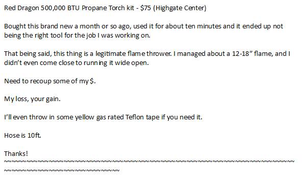Bought this brand new last year. Used it for about ten minutes, and it ended up not being the right tool for the job I had at hand. That being said... this is a legitimate flamethrower that would put's Elon Musk's little hairdryer (That roofing torch thing he sold years ago) to shame! Roars like a literal dragon. Will kick out a flame somewhere between ~12"-18" (It may possibly put out a bigger flame. I was too chicken to run it 100% wide open. Hah.)