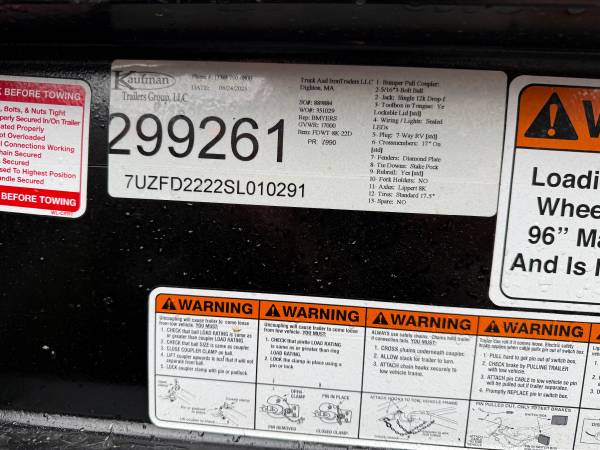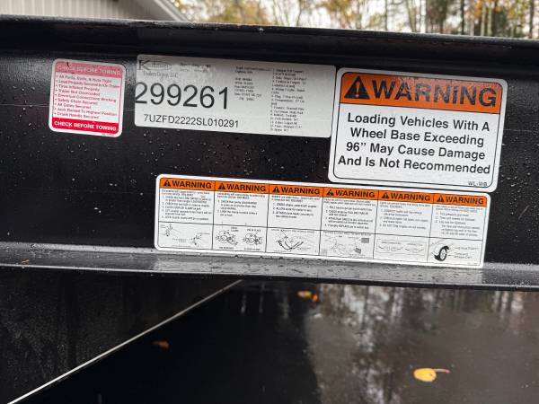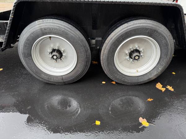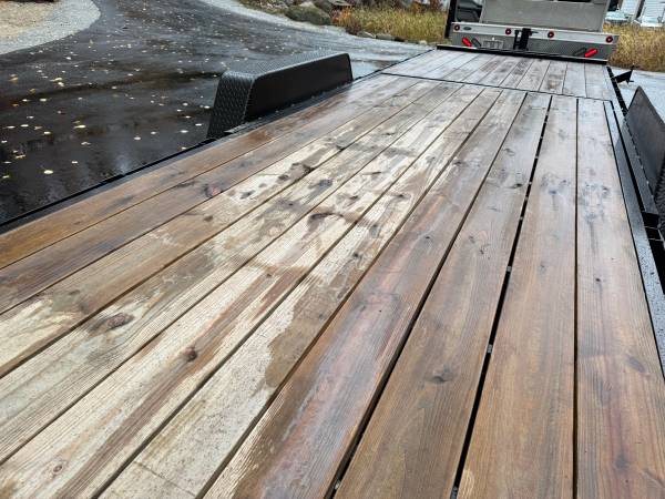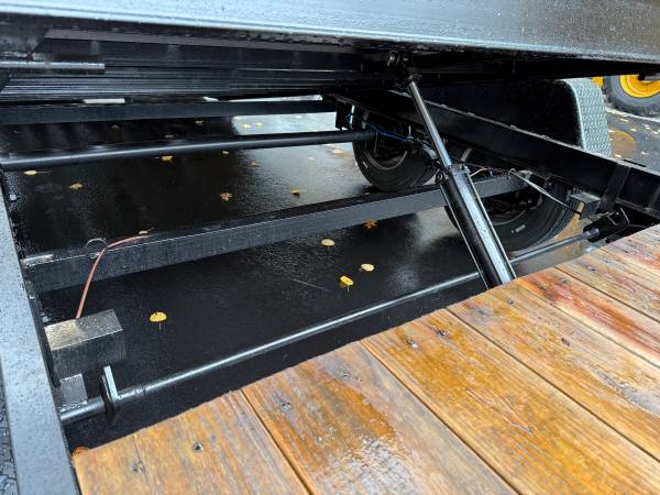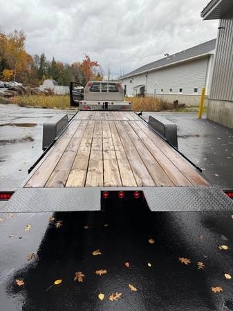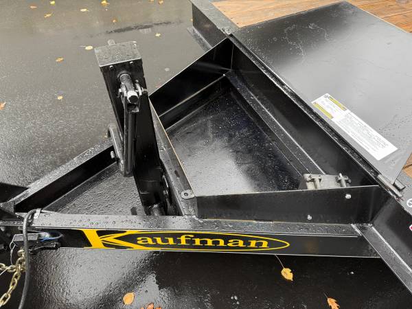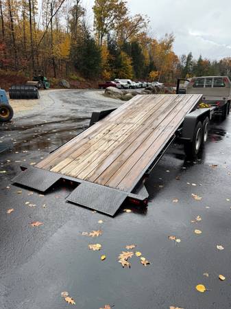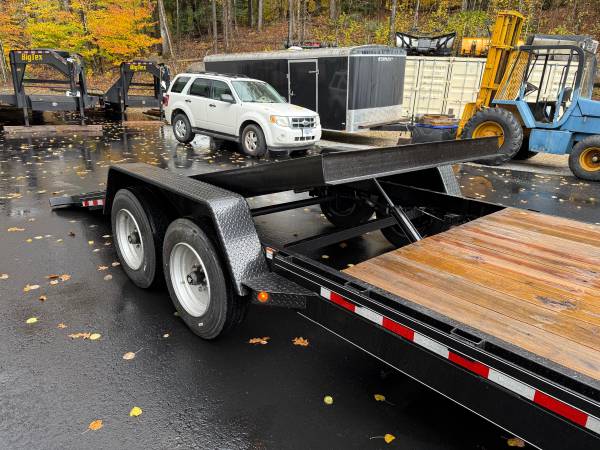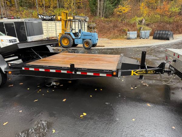 2025 Kaufman Tilt Deck Trailer for sale. This is a new trailer that we purchased to use ourselves . We do not need it because we have enough other equipment trailers to fill the spot. 17000 pound GVWR. 2-8000 lb Wet Bath Axles with Electric Brakes. 2 5/16 Ball Hithch. 7 Way Plug. 22 foot wood deck ( 8' x14' Tilt deck with Hydraulic Cylinder ) 26" deck Height. As new condition . Priced to sell at $8700. Hillsboro Jeep/Ram - Hillsboro NH . Contact Greg in Parts department . Tel 603-464-5200. $8700.