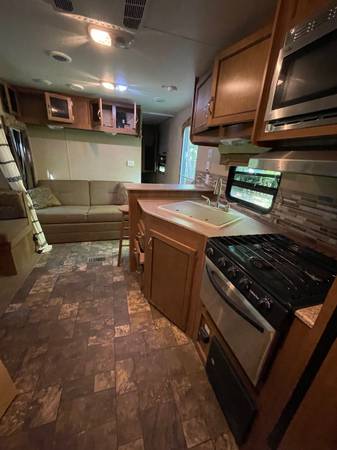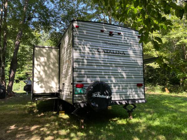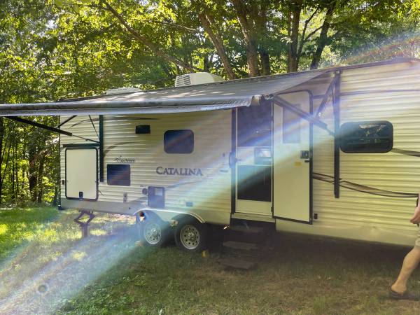 2016 Coachman Catalina travel trailer for sale. 27 feet long, one queen size bed, dinette converts into double bed, and one fold-out couch. Flat screen tv, electric fireplace, full kitchen plus outdoor refrigerator. Awning with LED lights. Bathroom with shower. Lots of storage space, in great shape and ready for use!