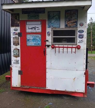 8 x 10 enclosed trailer, fully finished inside including a propane heater! Has lights and a stereo that can run off a car battery or use the brand-new 12-volt to AC converter that we bought but never used. We purchased this to use as a mobile art space but ended up going in a different direction. The artwork is decals so can be easily removed.