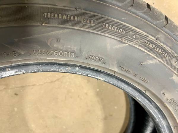 ONE: 235/60/18” Goodyear Eagle Sport All-Season tire. Measured tread depth of 10/32” New measures 11/32” Cost was $230 new, selling this one tire for $60 cash upon pickup in or around Saint Albans...