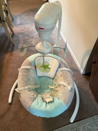 Fisher-Price cradle swing. Designed for an infant up to a baby that can’t sit up or roll over yet. Barely used. Collected more dirt and smudges on it storing it and moving it around then being used. Electric plug-in, lullaby, music, or soothing sound effects. A fisheye mirror over top with multicolored moon and star logos on spring for babies attention. Ultra soft worm fleece lines for comfort and four point harness for safety. This thing has been great, but the baby is outgrown it and moved on. Usually ranging $100-$200 in retail stores. Already put together so delivery can be available.
