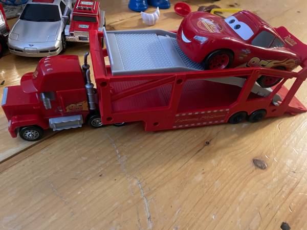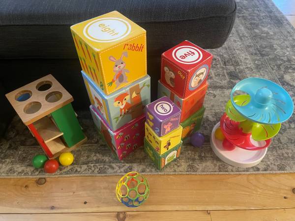 (1) wooden square ball tower w 3 (green,red,yellow) (1) set of cardboard nesting cubes w animal&number images (1) plastic ball spiral tower w 9 Hess fire truck, Hess monster truck, Hess "Jeep"...